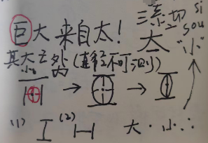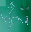 那基于这个来说,是吧,我们翻过来,那原来在丙之前的这个叫甲乙,我怎么来表示,是吧,这是点(是甲),这从零开始,假如说我这个分这叫乙,对不对,那么,下边的这个东西就是丙,这个东西就是丁,,甲乙丙丁。对不对,那这个字就是个啥字?这个字就是个太字,它为什么要读太,因为这个字它还读通,理论上它的是通,通什么?通大,通大(dai)(切太tai),大在这读大夫的dai,因为你前面是丙,丙是乖恶嘛,是吧,哎所以说它叫太,当然也读ta,你也可以读ta发大的那个音哎。